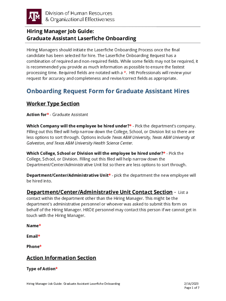 Hiring Manager Job Guide: Graduate Assistant Laser fiche Onboarding Hiring Managers should initiate the Laser fiche Onboarding Process once the final candidate has been selected for hire. The Laser