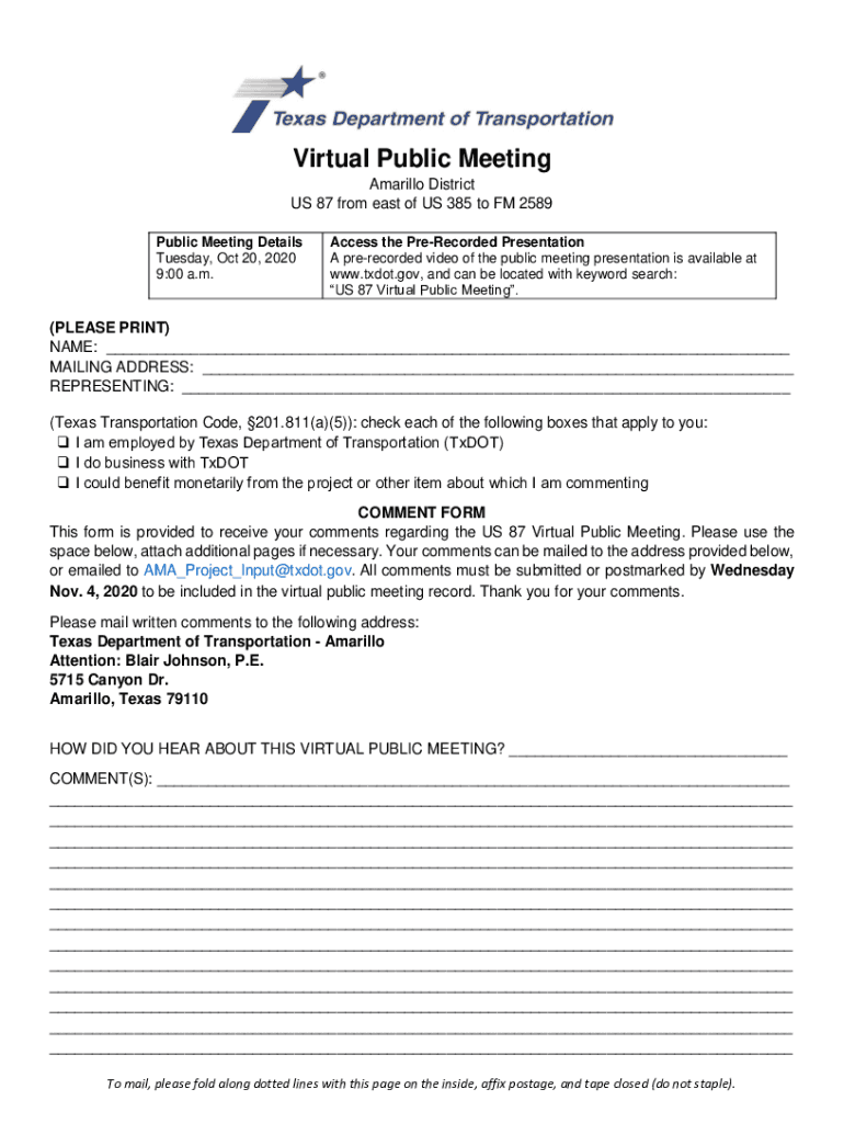 Virtual Public Meeting Amarillo District US 87 from east of US 385 to FM 2589 Public Meeting Details Tuesday, Oct 20, 2020 9:00 a.m. Access the PreRecorded Presentation A prerecorded video of the