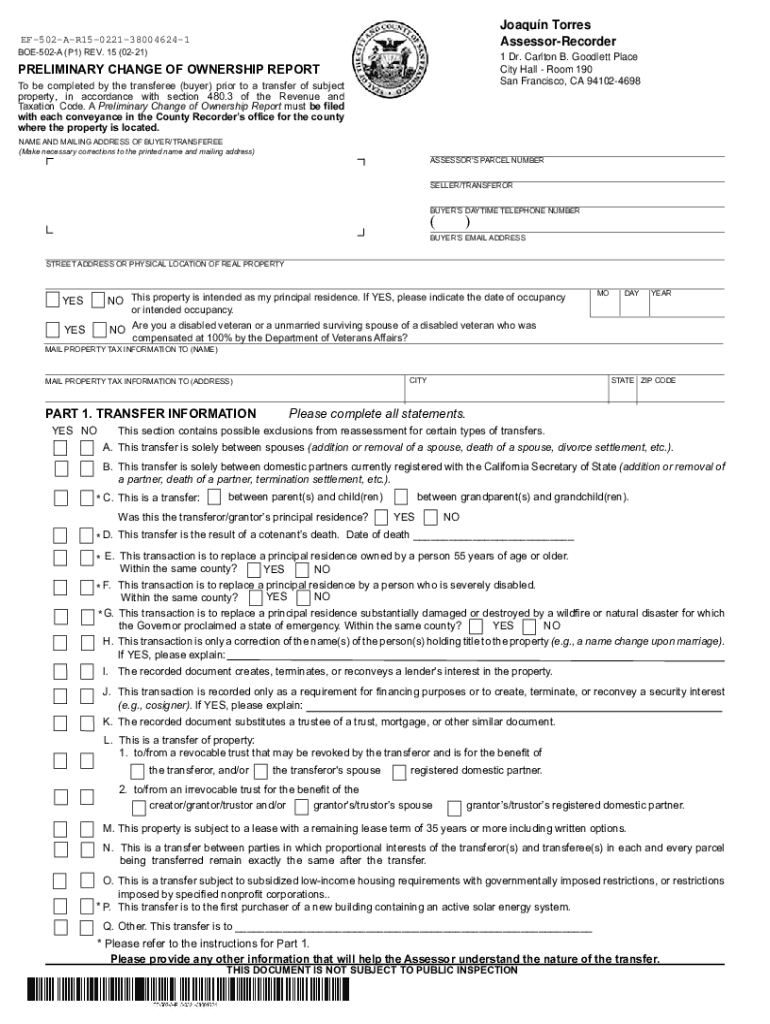 Joaquin Torres AssessorRecorderEF502AR150221380046241 BOE502A (P1) REV. 15 (0221)1 Dr. Carlton B. The Goodliest Place City Hall Room 190 San Francisco, CA 941024698PRELIMINARY CHANGE OF OWNERSHIP