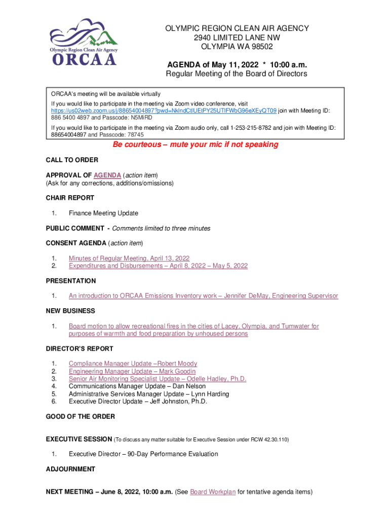 OLYMPIC REGION CLEAN AIR AGENCY 2940 LIMITED LANE NW OLYMPIA WA 98502 AGENDA of May 11, 2022 × 10:00 a.m. Regular Meeting of the Board of Directors Orcas meeting will be available virtually If you