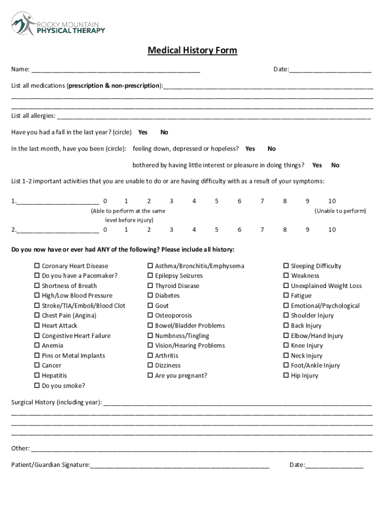 Patient health history form is a document that collects information about a patient's past medical history, current health conditions, medications, allergies, surgeries, and family medical history.