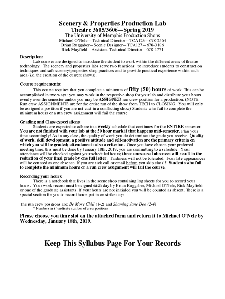Scenery & Properties Production Lab Theater 3605/3606Spring 2019The University of Memphis Production Shops Michael ONeleTechnical DirectorTCA1236782564 Brian RuggaberScenic DesignerTCA1276783186 Rick