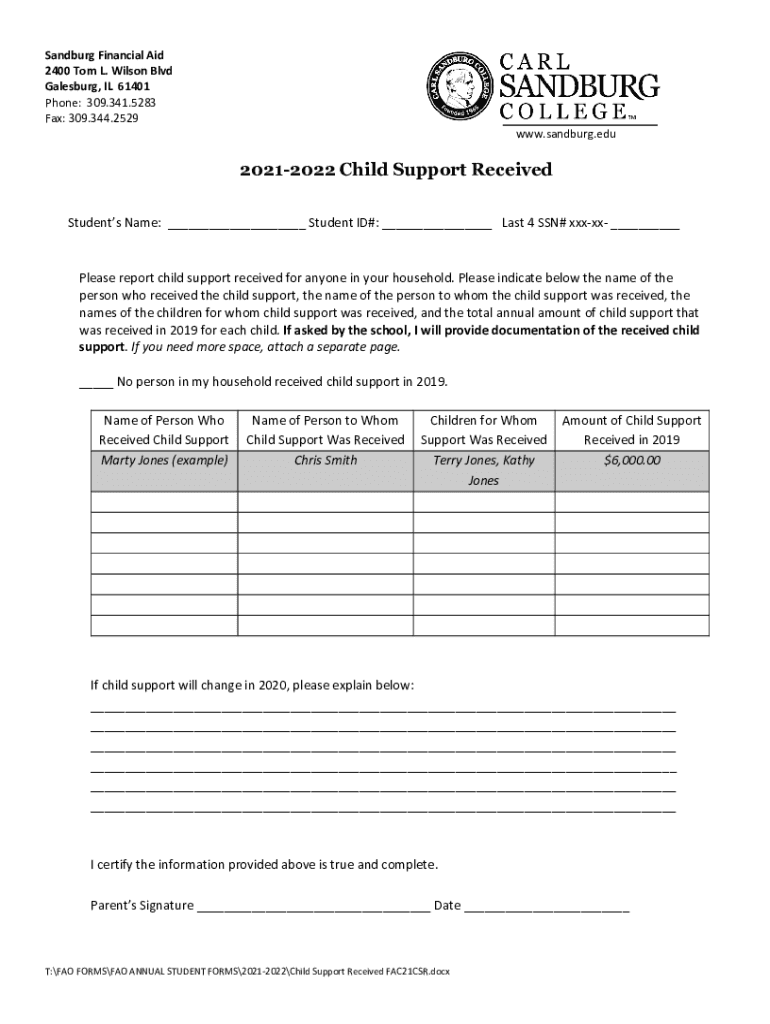 Sandburg Financial Aid 2400 Tom L. Wilson Blvd Galesburg, IL 61401 Phone: 309.341.5283 Fax: 309.344.2529 www.sandburg.edu20212022 Child Support Received Students Name: ___ Student ID#: ___ Last 4