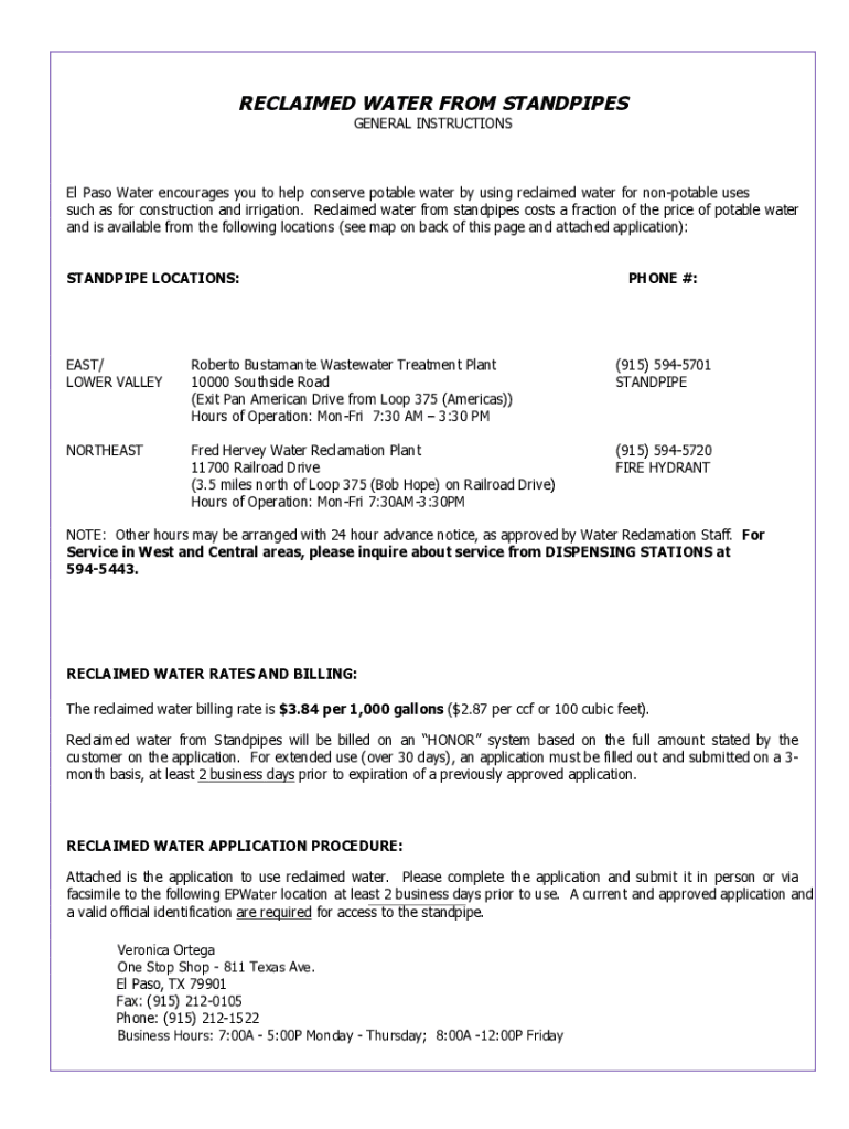 RECLAIMED WATER FROM STANDPIPES GENERAL Instructions Pass Water encourages you to help conserve potable water by using reclaimed water for nonpotable uses such as for construction and irrigation.