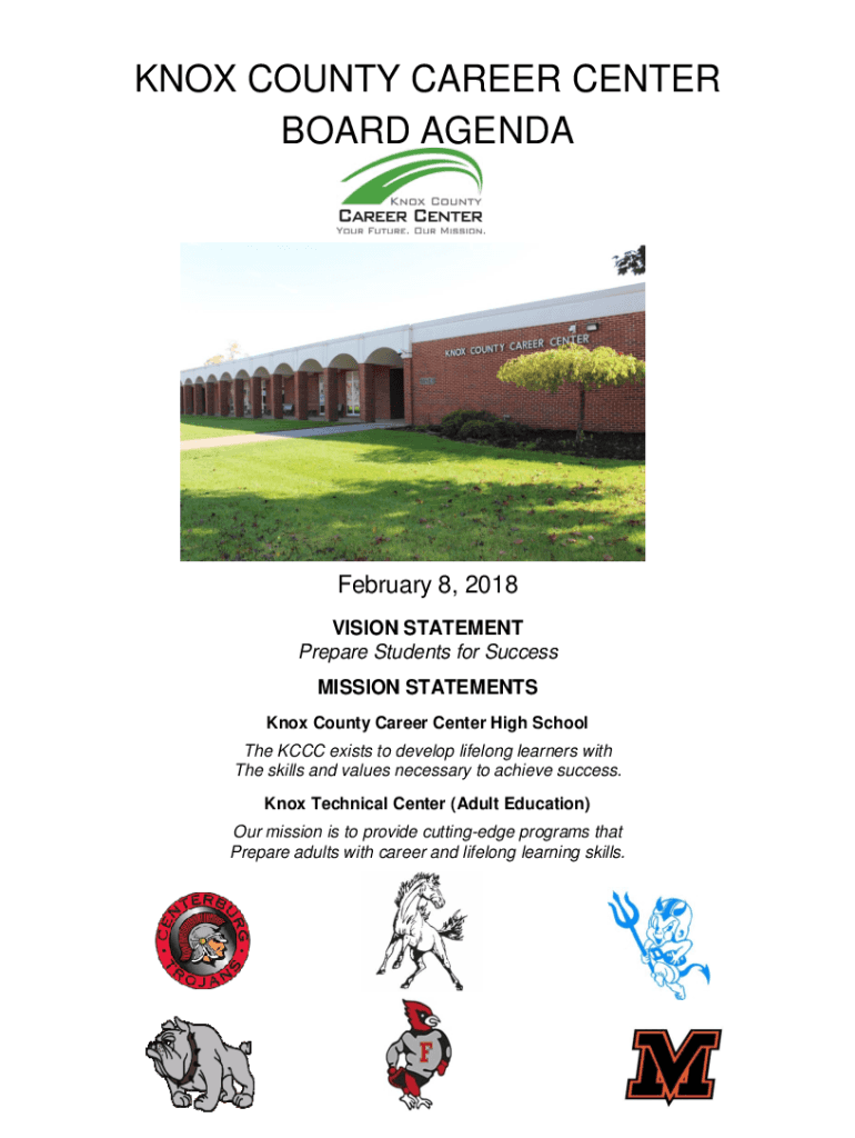 KNOX COUNTY CAREER CENTER BOARD AGENDA February 8, 2018, VISION STATEMENT Prepare Students for Success MISSION STATEMENTS Knox County Career Center High School The CCC exists to develop lifelong learners