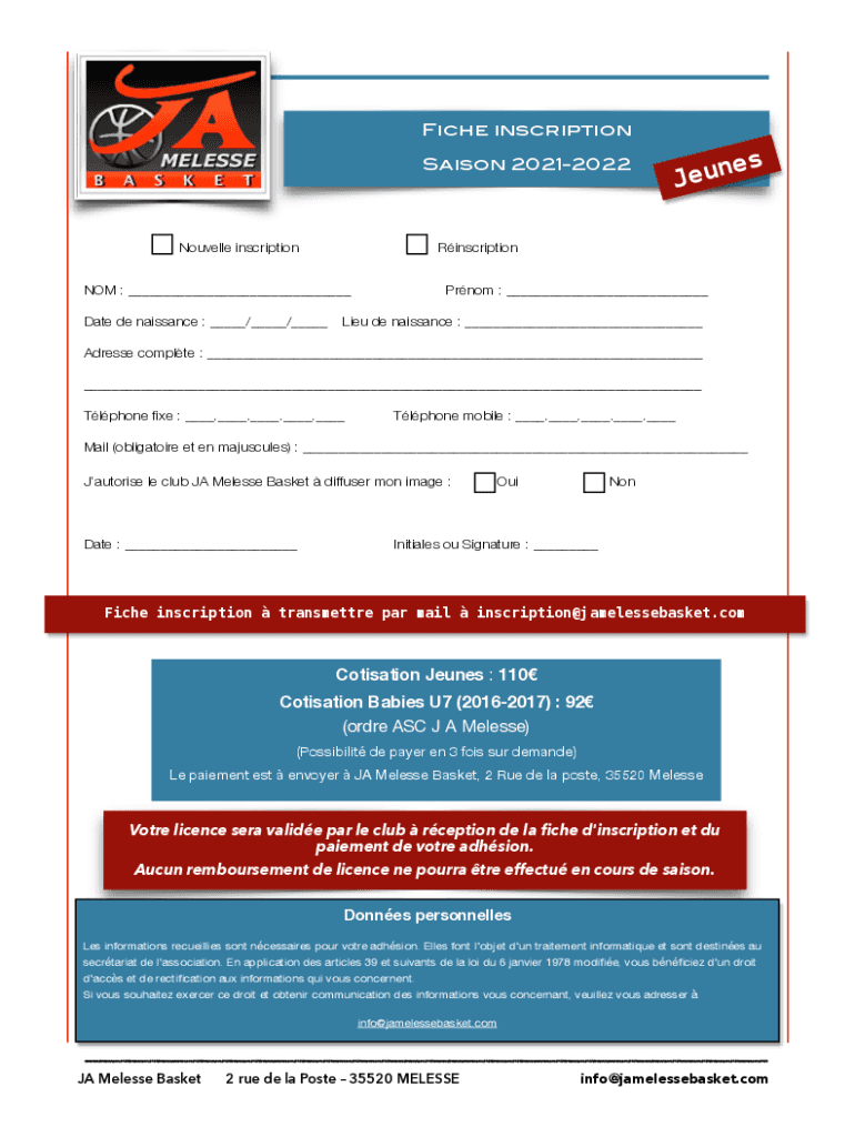 Fiche inscriptionJeunSaison 20212022Nouvelle inscription : ___esRinscriptionPrnom : ___Date de Renaissance : ___/___/___Lieu de Renaissance : ___