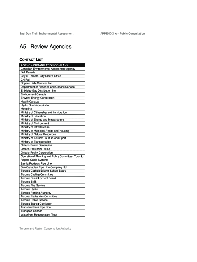 East Don Trail Environmental AssessmentA5. Review Agencies CONTACT LIST AGENCY/ORGANIZATION/COMPANY Canadian Environmental Assessment Agency Bell Canada City of Toronto, City Clerk\'s Office CN Rail