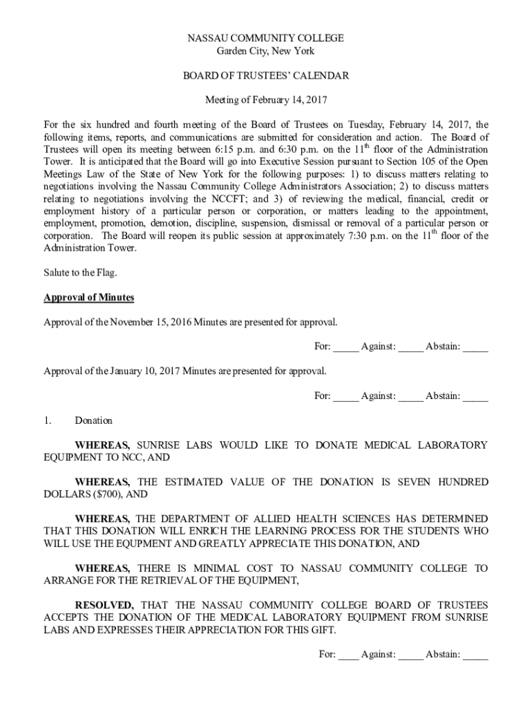 NASSAU COMMUNITY COLLEGE Garden City, New York BOARD OF TRUSTEES CALENDAR Meeting of February 14, 2017, For the six hundred and fourth meeting of the Board of Trustees on Tuesday, February 14, 2017,