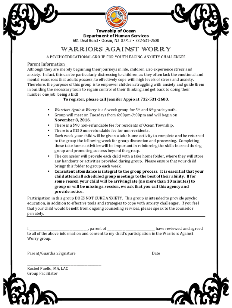 Township of OceanDepartment of Human Services 601 Deal Road Ocean, NJ 07712 7325312600WARRIORS AGAINST WORRY A PSYCHOEDUCATIONAL GROUP FOR YOUTH FACING ANXIETY CHALLENGESParent Informational though
