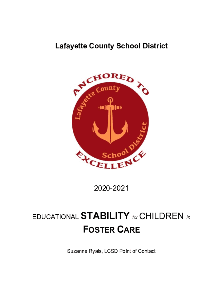 Lafayette County School District20202021 EDUCATIONAL STABILITY for CHILDREN foster CARE Suzanne Reals, LCD Point of ContactVision Statement Lafayette County School District2Mission Statement Lafayette