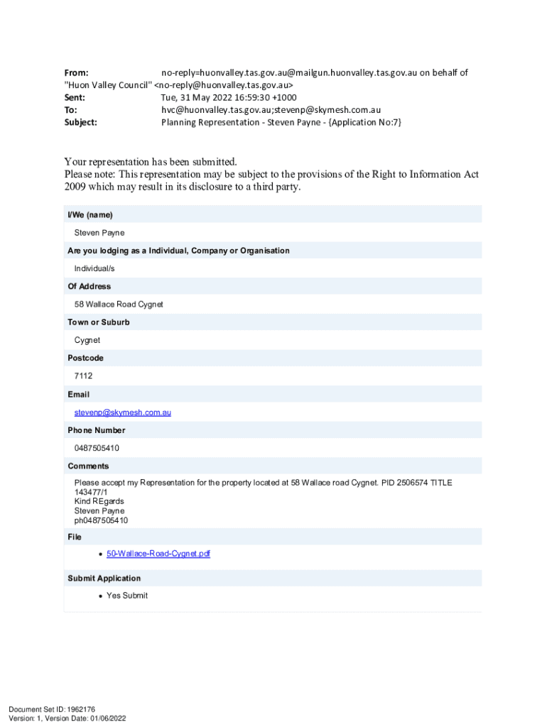 From: noreplyhuonvalley.tas.gov.au@mailgun.huonvalley.tas.gov.au on behalf of \” Huron Valley Council\” noreply@huonvalley.tas.gov.au Sent: Tue, 31 May 2022 16:59:30 +1000 To: hvc@huonvalley.tas.gov.au;stevenp@skymesh.com.au