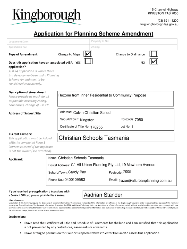 15 Channel Highway KINGSTON TAS 7050 (03) 6211 8200 kc@kingborough.tas.gov.auApplication for Planning Scheme Amendment Judgement Date:Property I'd No:Application No:Zoning:Type of Amendment:Change