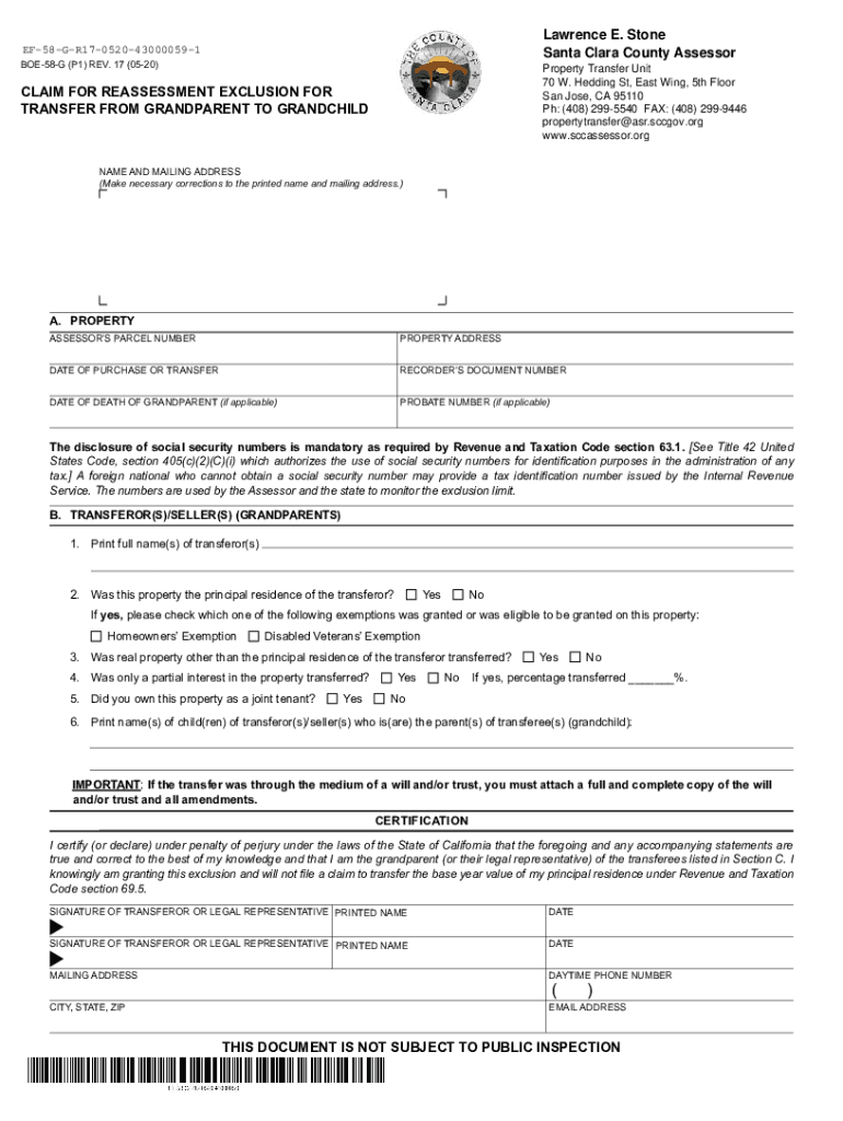 Lawrence E. Stone Santa Clara County AssessorEF58GR170520430000591 BOE58G (P1) REV. 17 (0520)Property Transfer Unit 70 W. Heading St, East Wing, 5th Floor San Jose, CA 95110 pH: (408) 2995540 FAX: