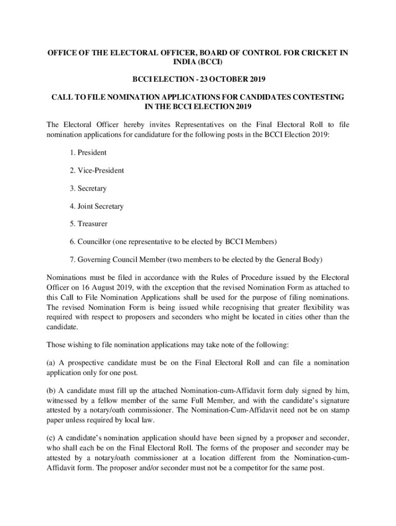 OFFICE OF THE ELECTORAL OFFICER, BOARD OF CONTROL FOR CRICKET IN INDIA (CCI) CCI ELECTION 23 OCTOBER 2019 CALL TO FILE NOMINATION APPLICATIONS FOR CANDIDATES CONTESTING IN THE CCI ELECTION 2019 The
