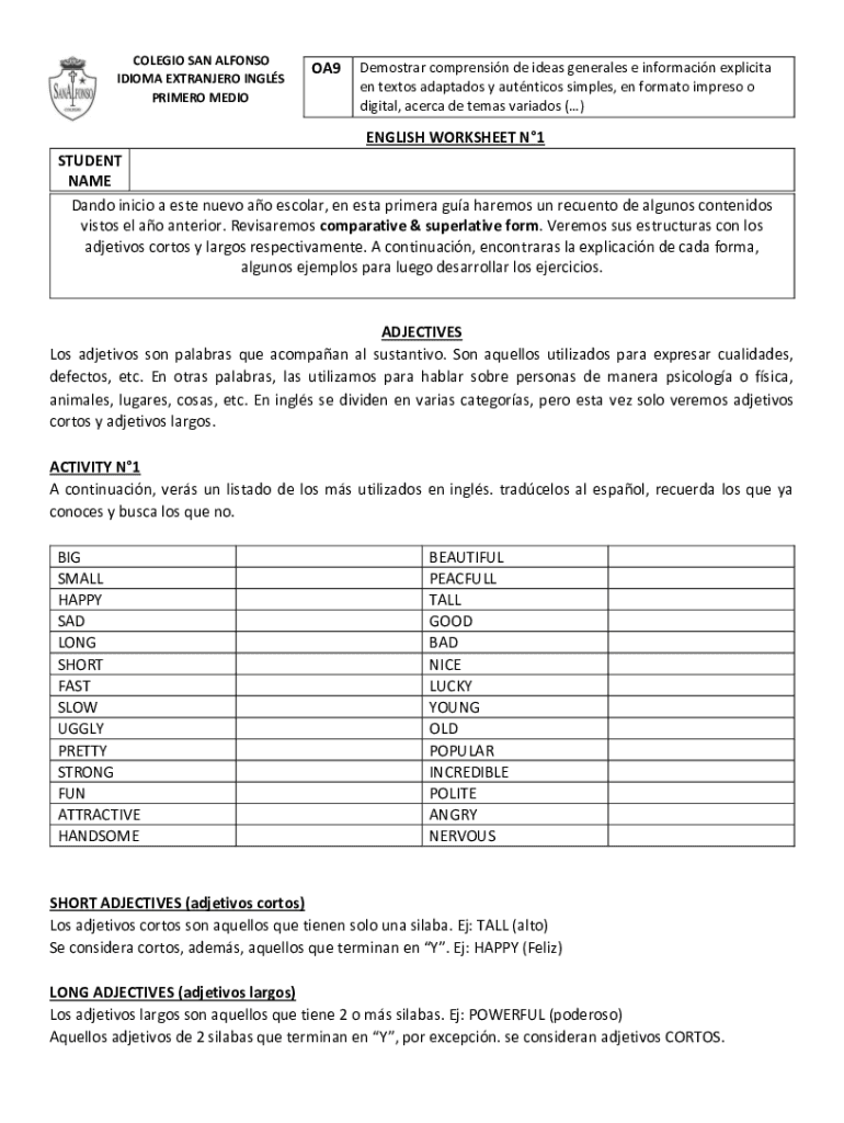 Obtener el gratis ENGLISH WORKSHEET N1 STUDENT NAME ADJECTIVES ...