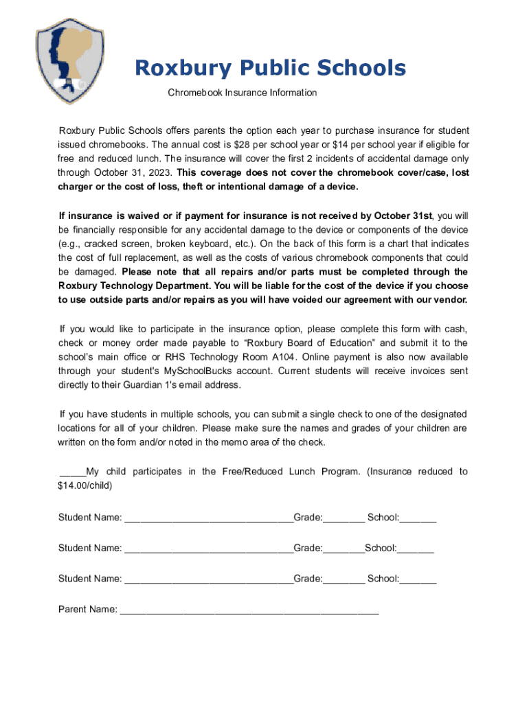 Roxbury Public Schools Chromebook Insurance InformationRoxbury Public Schools offers parents the option each year to purchase insurance for student issued Chromebooks. The annual cost is $28 per school