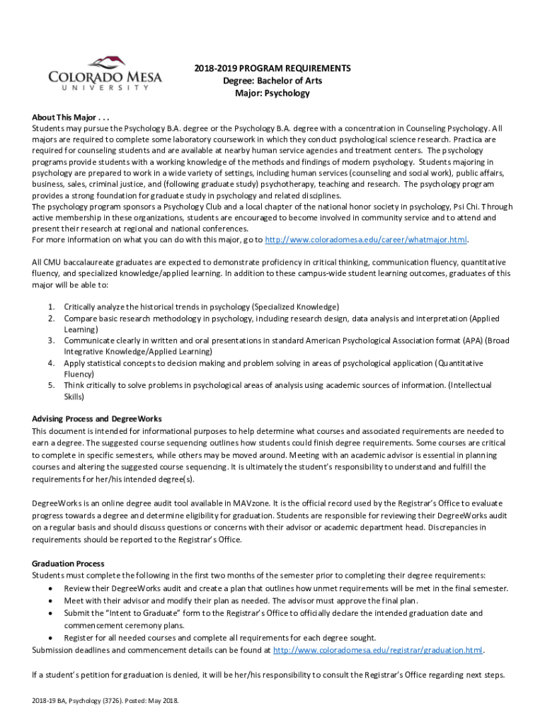 20182019 PROGRAM REQUIREMENTS Degree: Bachelor of Arts Major: Psychology About This Major. . . Students may pursue the Psychology B.A. degree or the Psychology B.A. degree with a concentration in