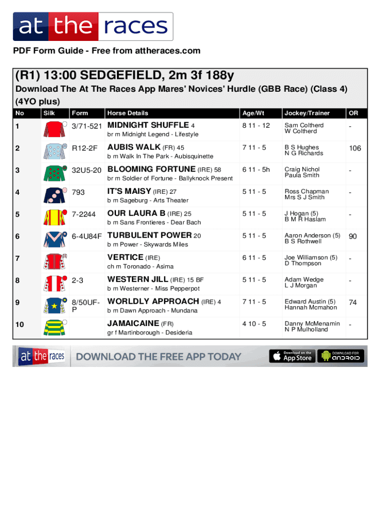 PDF Form Guide Free from attheraces.com(R1) 13:00 SEDGEFIELD, 2 m 3f 188y Download The At The Races App Mares\' Novices\' Hurdle (GB Race) (Class 4) (4YO plus) No1SilkFormHorse Details3/71521 MIDNIGHT