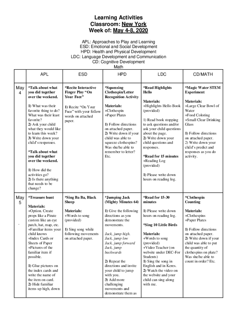 Learning Activities Classroom: New York Week of: May 48, 2020 APL: Approaches to Play and Learning ESD: Emotional and Social Development HPD: Health and Physical Development LDC: Language Development