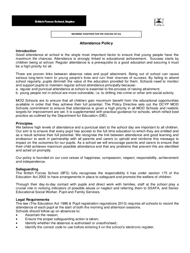 British Forces School, NaplesWORKING TOGETHER FOR THE SUCCESS OF Attendance Policy Introduction Good attendance at school is the single most important factor to ensure that young people have the maximum