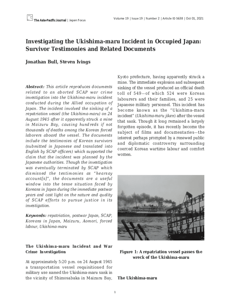 The Asia Pacific Journal | Japan FocusVolume 19 | Issue 19 | Number 2 | Article ID 5638 | Oct 01, 2021Investigating the Ukishimamaru Incident in Occupied Japan: