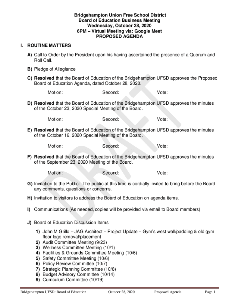 Bridgehampton Union Free School District Board of Education Business Meeting Wednesday, October 28, 2020 6PM Virtual Meeting via: Google Meet PROPOSED AGENDA I. ROUTINE MATTERS A) Call to Order by