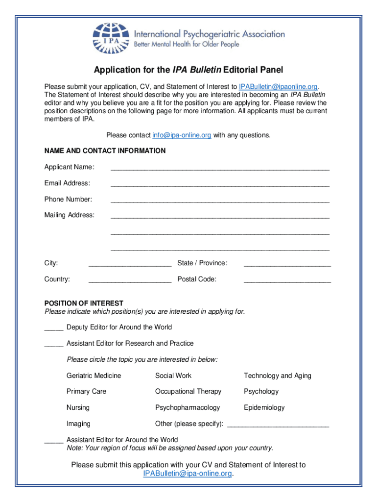 Application for the IPA Bulletin Editorial Panel Please submit your application, CV, and Statement of Interest to IPABulletin@ipaonline.org. The Statement of Interest should describe why you are interested