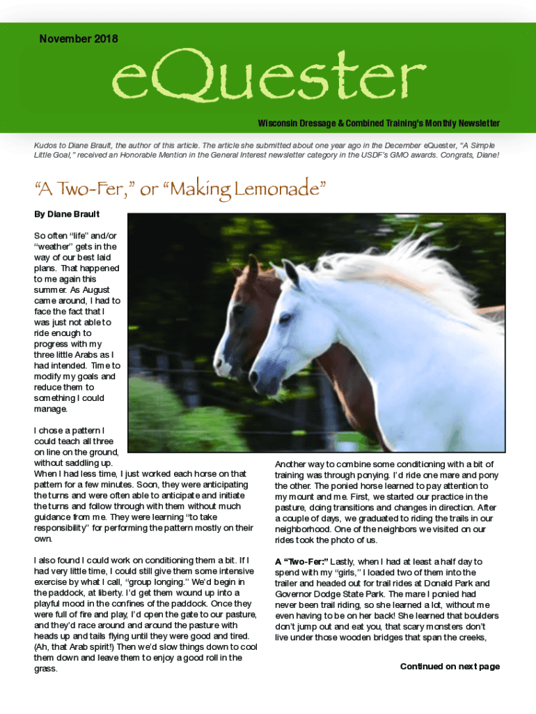 EQuesterNovember 2018 Wisconsin Dressage & Combined Trainings Monthly NewsletterKudos to Diane Bra ult, the author of this article. The article she submitted about one year ago in the December requester,