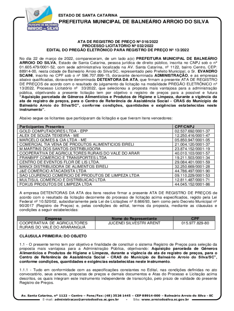 ESTATE DE SANTA CATARINAPREFEITURA MUNICIPAL DE ALBERIO ARROYO DO SILVANA DE REGISTRY DE PRO N 016/2022 PROCESS LIMITATION N 032/2022 EDIT AL DO PRESO ELECTRIC PARA REGISTRY DE PRO N 13/2022 Now did
