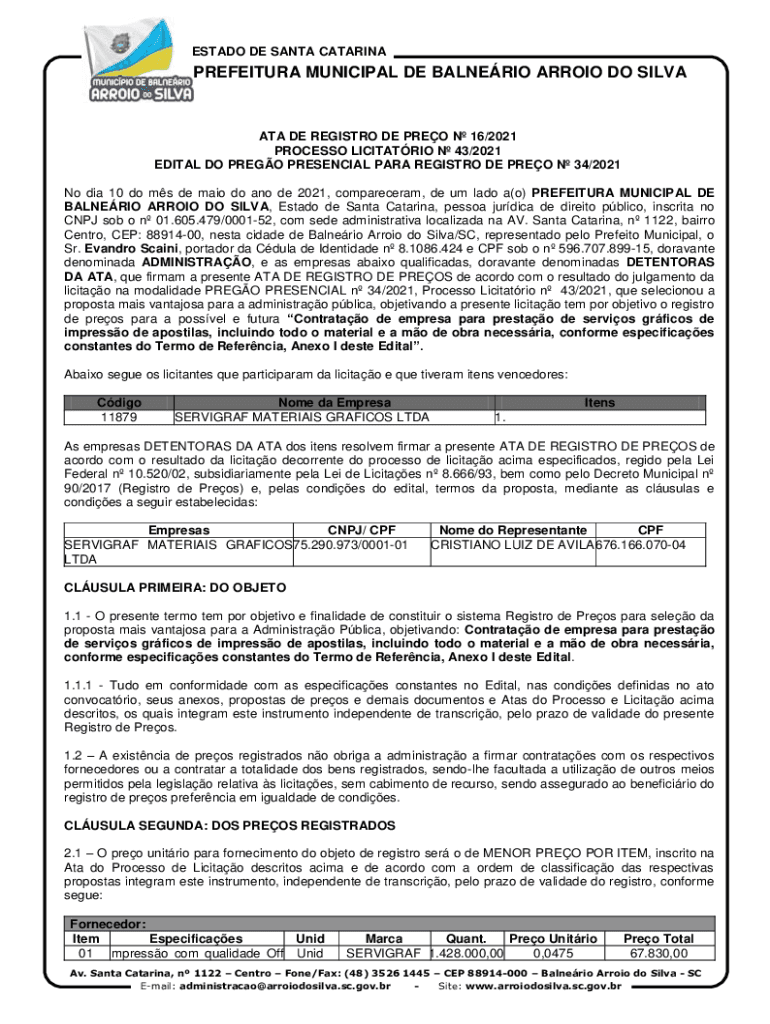 ESTATE DE SANTA CATARINAPREFEITURA MUNICIPAL DE ALBERIO ARROYO DO SILVANA DE REGISTRY DE PRO N 16/2021 PROCESS LIMITATION N 43/2021 EDIT AL DO PRESO PRESENCE PARA REGISTRY DE PRO N 34/2021 Now did