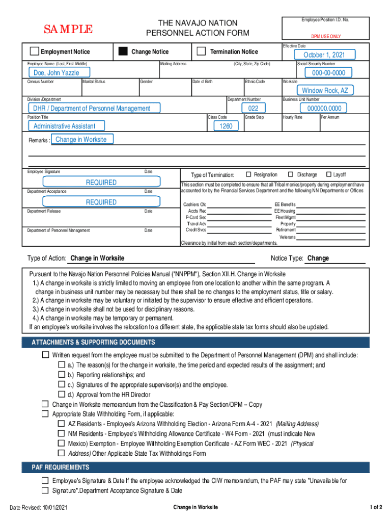 SAMPLE Employment NoticeChange NoticeEmployee Name (Last, First Middle)Effective Date October 1, 2021(City, State, Zip Code)Social Security Number. O. Box 0000; Window Rock, AZ. 86511 Marital StatusSingle