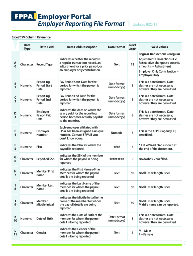 Employer Reporting File Format |Updated 9/20/18Excel/CSV Column Referenced