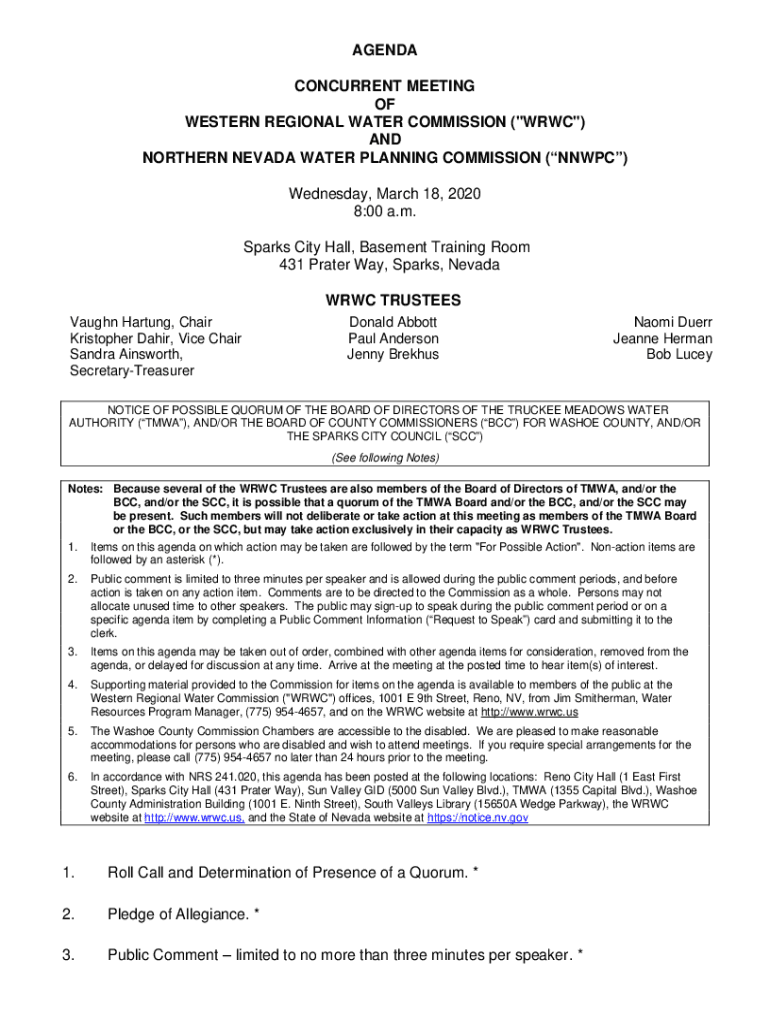 AGENDA CONCURRENT MEETING OF WESTERN REGIONAL WATER COMMISSION (\” WRC\”) AND NORTHERN NEVADA WATER PLANNING COMMISSION (NPC) Wednesday, March 18, 2020 8:00 a.m. Sparks City Hall, Basement Training