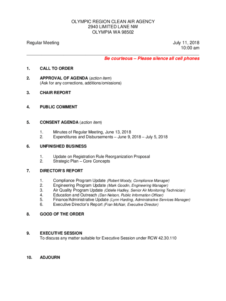 OLYMPIC REGION CLEAN AIR AGENCY 2940 LIMITED LANE NW OLYMPIA WA 98502 Regular Meeting July 11, 2018 10:00 am ___ Be courteous Please silence all cell phones 1.CALL TO ORDER2.APPROVAL OF AGENDA (action