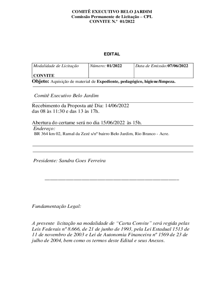 Modalidade de LicitaoNmero: 01/2022Data de Emission:07/06/2022CONVITE