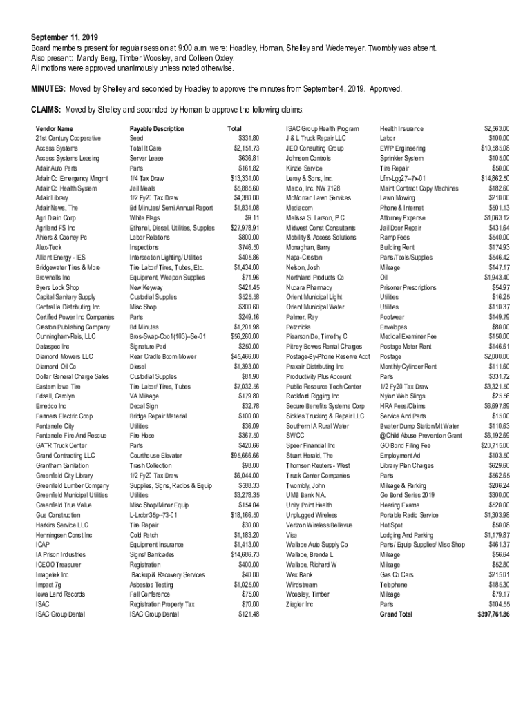 September 11, 2019, Board members present for regular session at 9:00 a.m. were: Hadley, Human, Shelley and Demeter. Tomboy was absent. Also present: Mandy Berg, Timber Loosely, and Colleen Oxley.