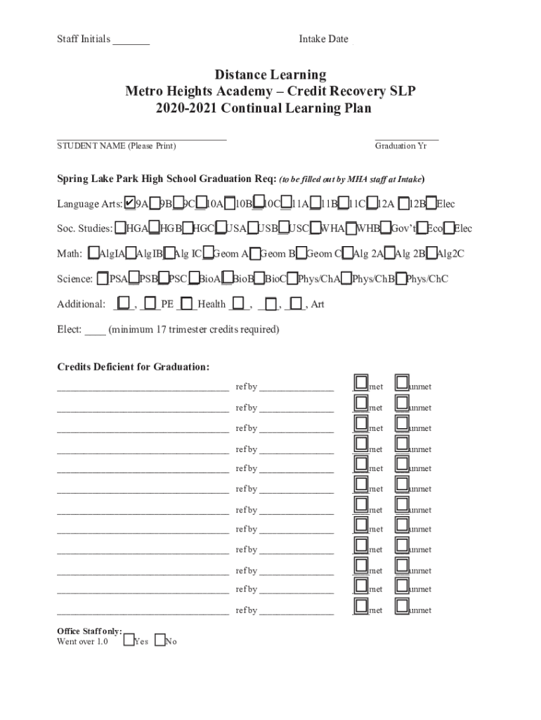 Staff Initials ___Intake Date ___BBBBBB___Distance Learning Metro Heights Academy Credit Recovery SLP 20202021 Continual Learning Plan ______STUDENT NAME (Please Print)Graduation Spring Lake Park