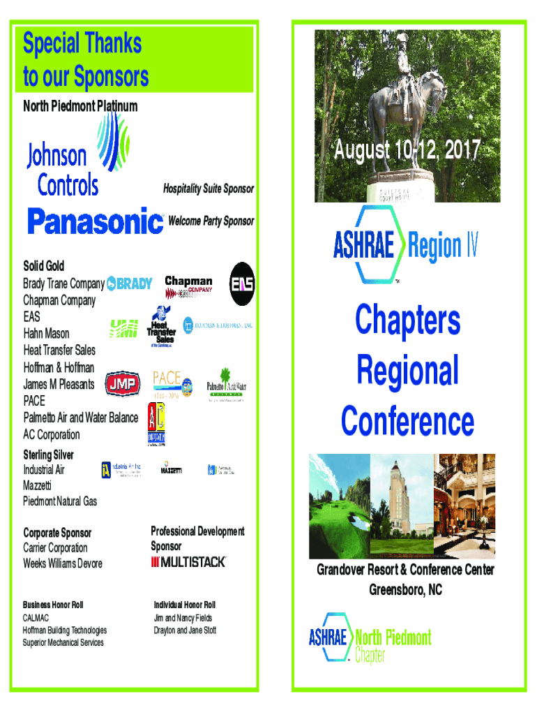 Special Thanks to our Sponsors North Piedmont Platinum August 1012, 2017 Hospitality Suite Sponsor Welcome Party Sponsorship Gold Brady Trade Company Chapman Company EAS Hahn Mason Heat Transfer Sales