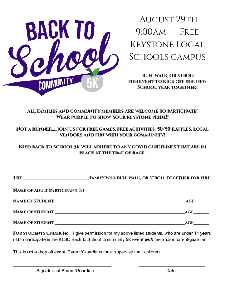 August 29th 9:00am Free Keystone Local Schools campus run, walk, or stroll fun event to kick off the new School year together!all Families and community members are welcome to participate! Wear purple