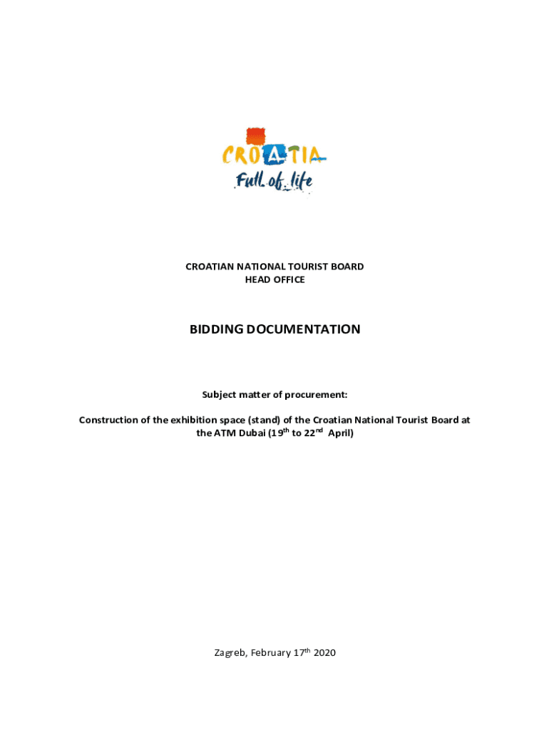 CROATIAN NATIONAL TOURIST BOARD HEAD OFFICEBIDDING DOCUMENTATIONSubject matter of procurement: Construction of the exhibition space (stand) of the Croatian National Tourist Board at the ATM Dubai