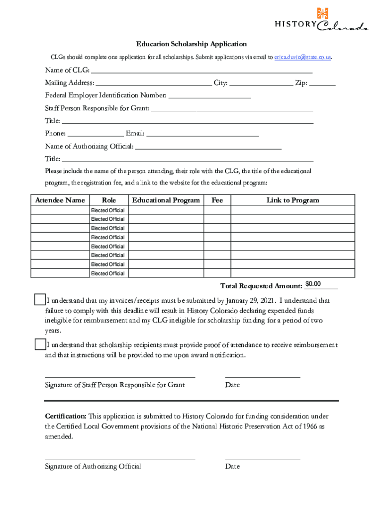 Education Scholarship Application Certified Local Government (CLG) Subgrant Program | Fiscal Year 2020 Application Deadline: November 30, 2020, Questions? Contact Erica Music at (303) 8664681 or erica.duvic@state.co.us