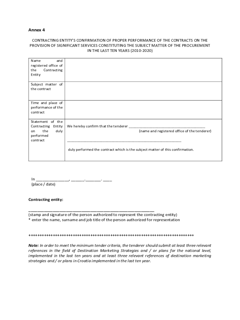 Annex 4 CONTRACTING ENTITY CONFIRMATION OF PROPER PERFORMANCE OF THE CONTRACTS ON THE PROVISION OF SIGNIFICANT SERVICES CONSTITUTING THE SUBJECT OF THE PROCUREMENT IN THE LAST TEN YEARS (20102020)