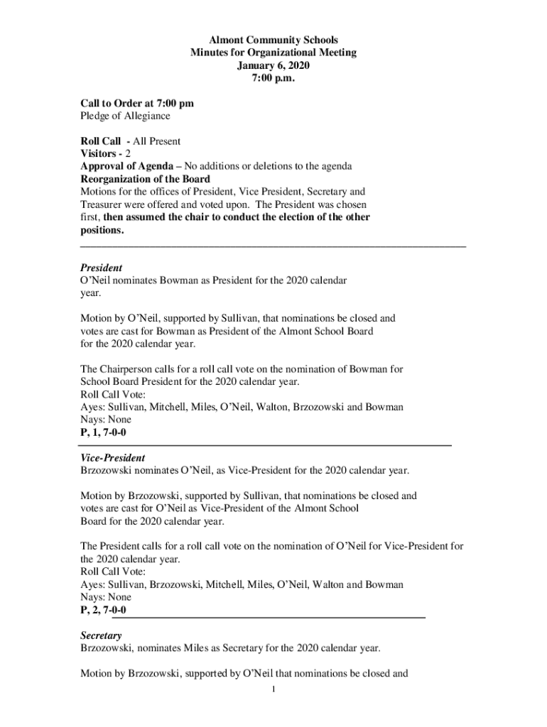 Almost Community Schools Minutes for Organizational Meeting January 6, 2020 7:00 p.m. Call to Order at 7:00 pm Pledge of Allegiance Roll Call All Present Visitors 2 Approval of Agenda No additions