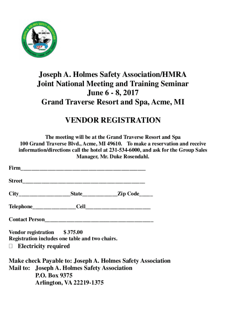 Joseph A. Holmes Safety Association/HERA Joint National Meeting and Training Seminar June 6 8, 2017 Grand Traverse Resort and Spa, Acme, MI VENDOR REGISTRATION The meeting will be at the Grand Traverse