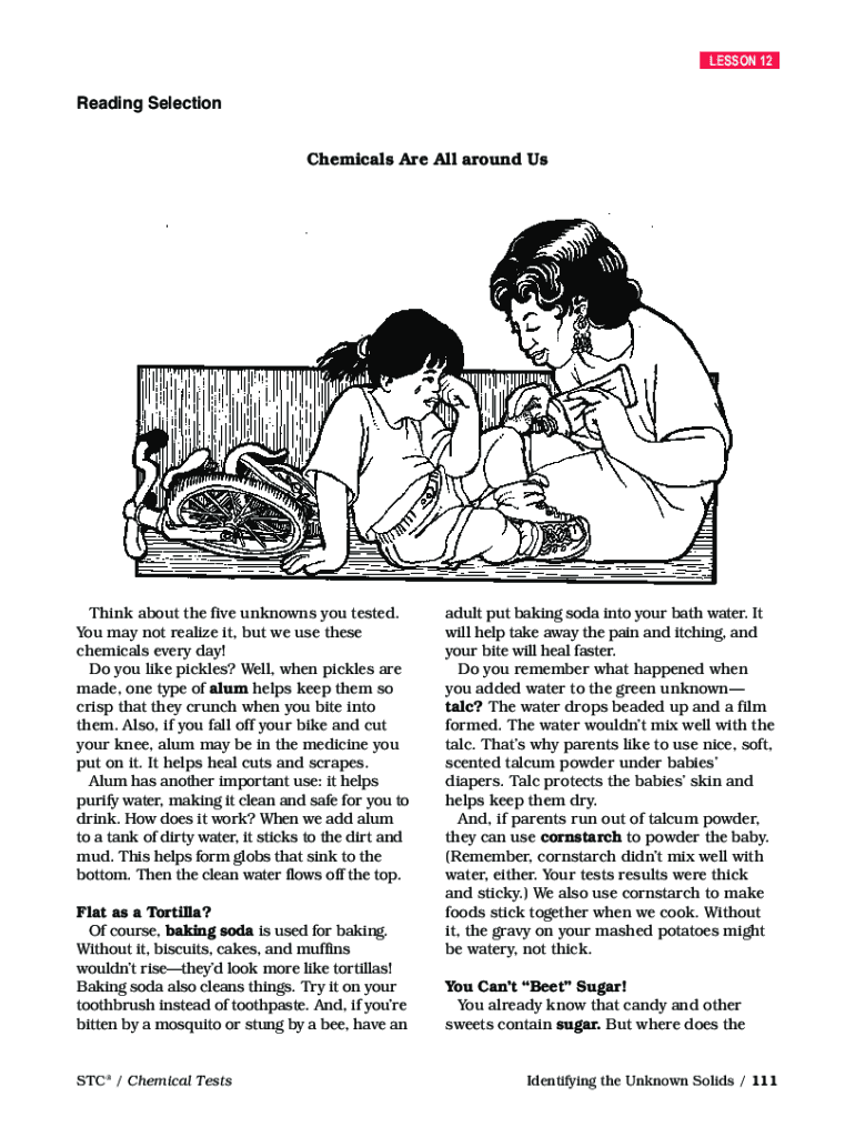 LESSON 12Reading Selection Chemicals Are All around Think about the five unknowns you tested. You may not realize it, but we use these chemicals every day! Do you like pickles? Well, when pickles