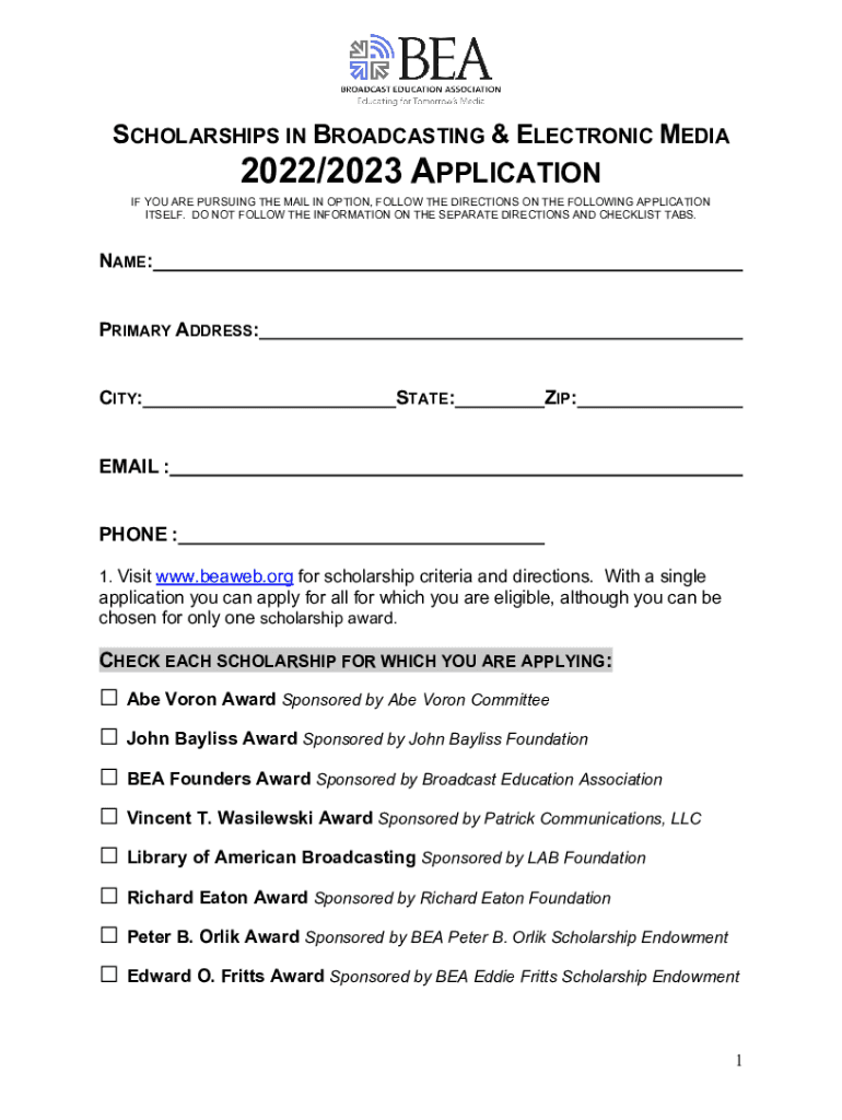SCHOLARSHIPS IN BROADCASTING & ELECTRONIC MEDIA2022/2023 APPLICATION IF YOU ARE PURSUING THE MAIL IN OPTION, FOLLOW THE DIRECTIONS ON THE FOLLOWING APPLICATION ITSELF. DO NOT FOLLOW THE INFORMATION