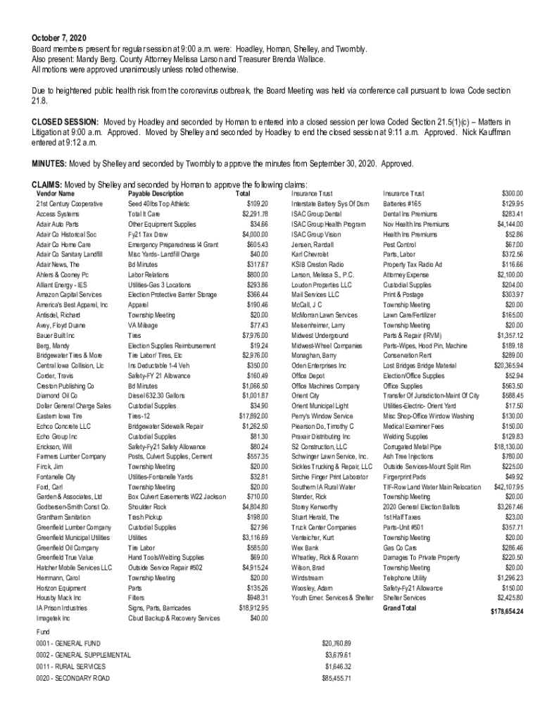 October 7, 2020, Board members present for regular session at 9:00 a.m. were: Hadley, Human, Shelley, and Tomboy. Also present: Mandy Berg. County Attorney Melissa Larson and Treasurer Brenda Wallace.