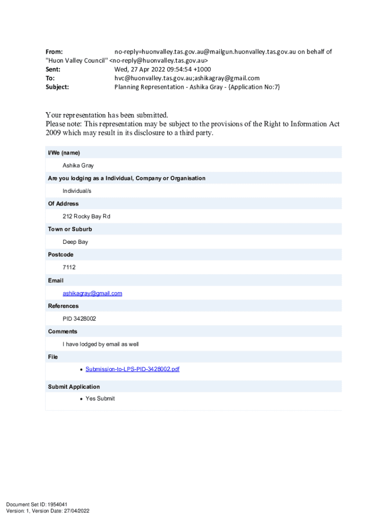 From: noreplyhuonvalley.tas.gov.au@mailgun.huonvalley.tas.gov.au on behalf of \” Huron Valley Council\” noreply@huonvalley.tas.gov.au Sent: Wed, 27 Apr 2022 09:54:54 +1000 To: hvc@huonvalley.tas.gov.au;ashikagray@gmail.com