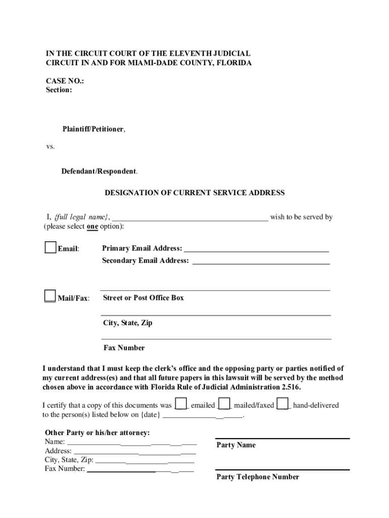 IN THE CIRCUIT COURT OF THE ELEVENTH JUDICIAL CIRCUIT IN AND FOR MIA MIDADE COUNTY, FLORIDA CASE NO.: Section:Plaintiff/Petitioner, vs. Defendant/Respondent. DESIGNATION OF CURRENT SERVICE ADDRESS
