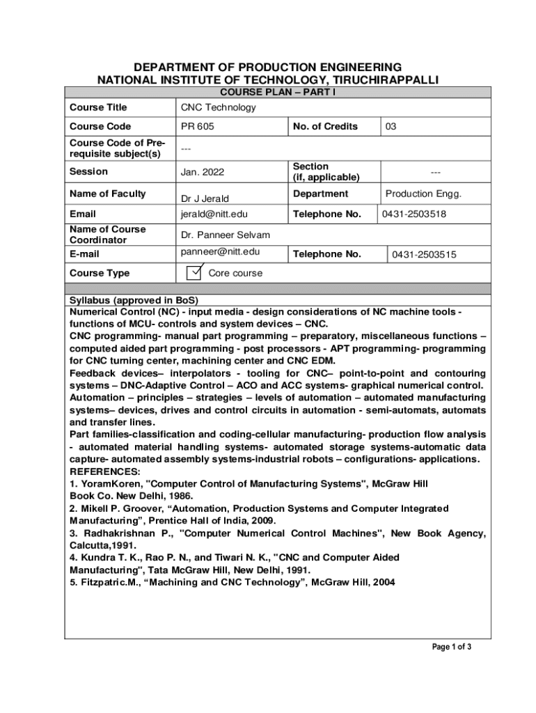 DEPARTMENT OF PRODUCTION ENGINEERING NATIONAL INSTITUTE OF TECHNOLOGY, TIRUCHIRAPPALLI COURSE PLAN PART I Course Title CNC TechnologyCourse Coder 605Course Code of Prerequisite subject(s)Session Jan.